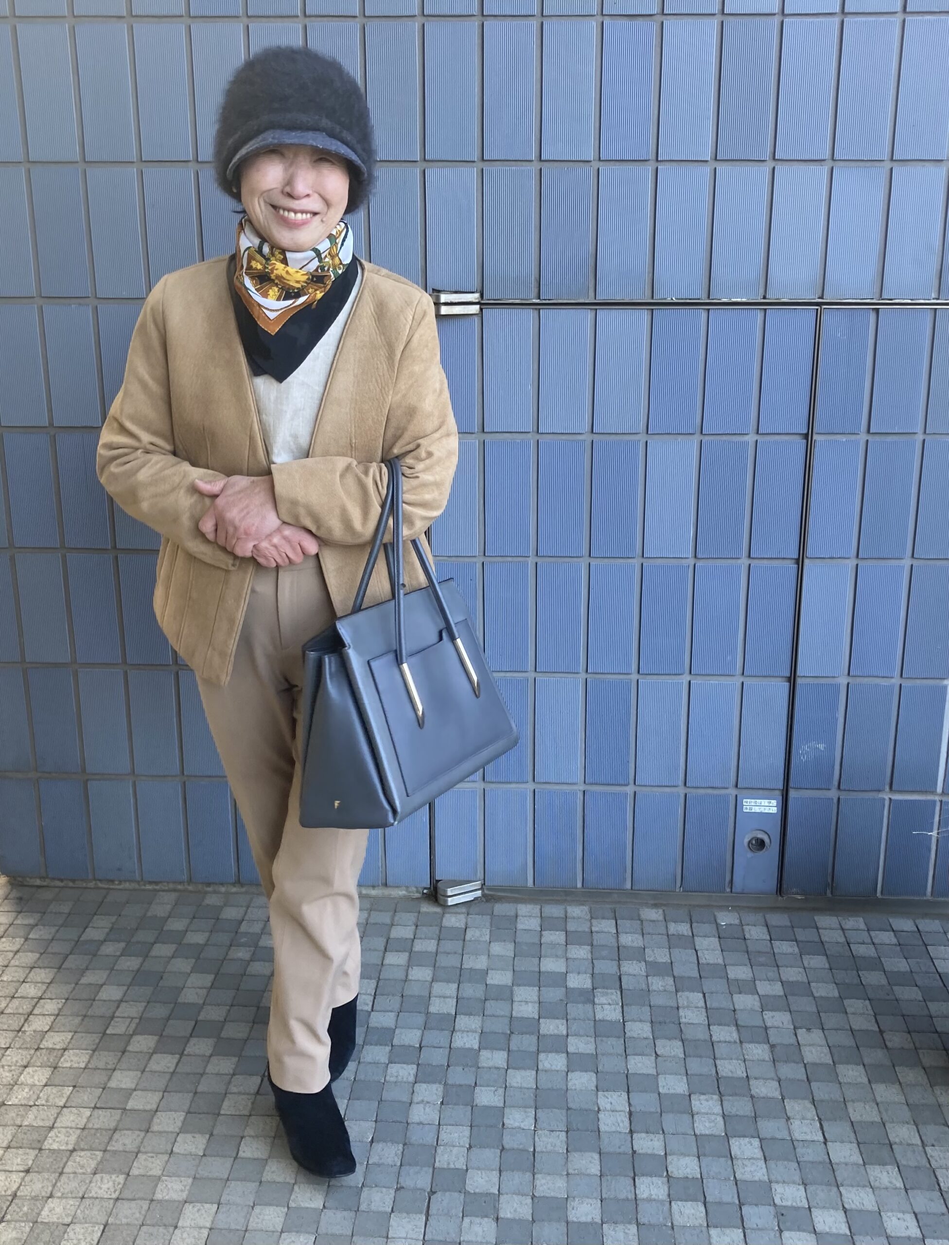 エルメスのスカーフ、黒ベルトをしめて、ベージュのベレー帽で可愛いクラシックテイストに。