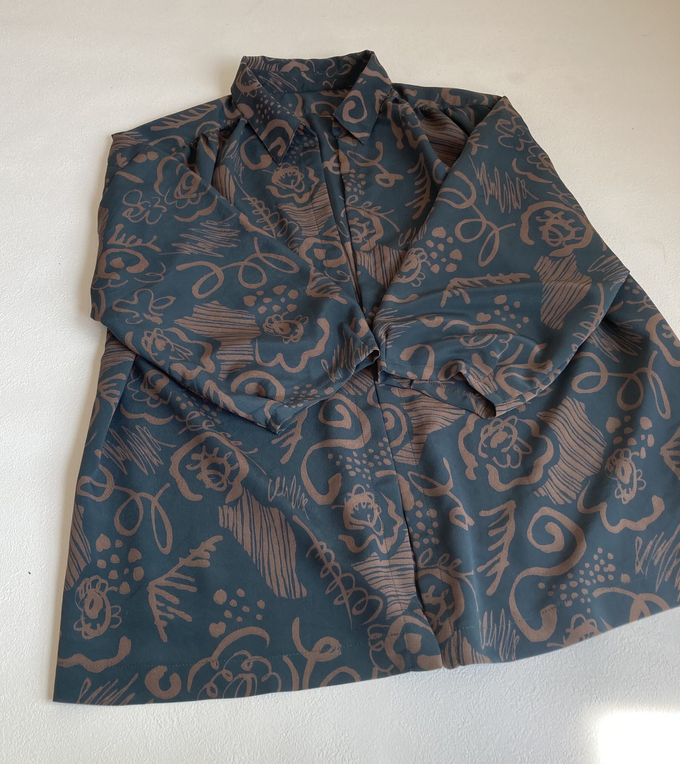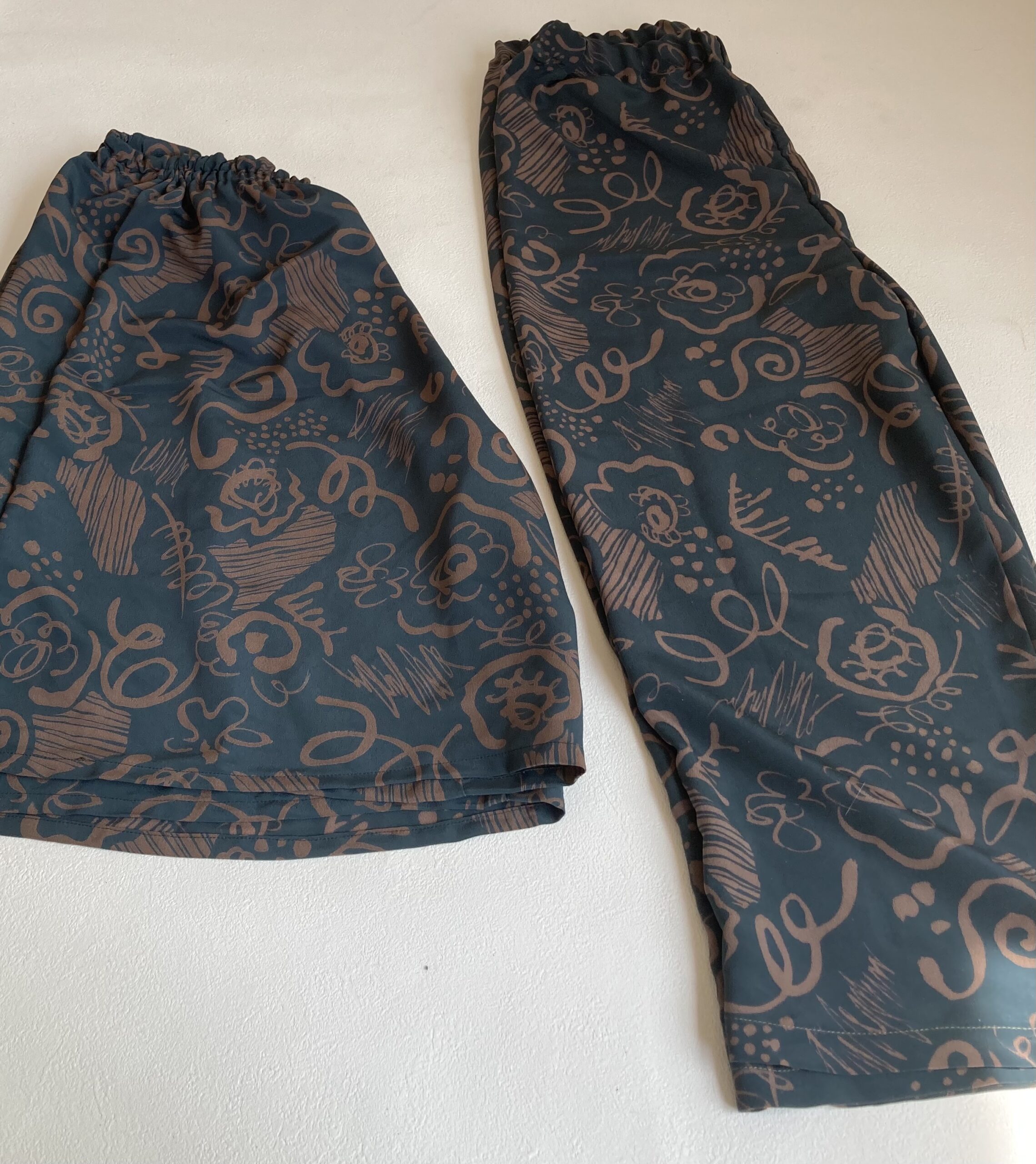 薄緑色のテロテロ植物柄の生地は半袖と短パンのセットの楽々部屋着へ
