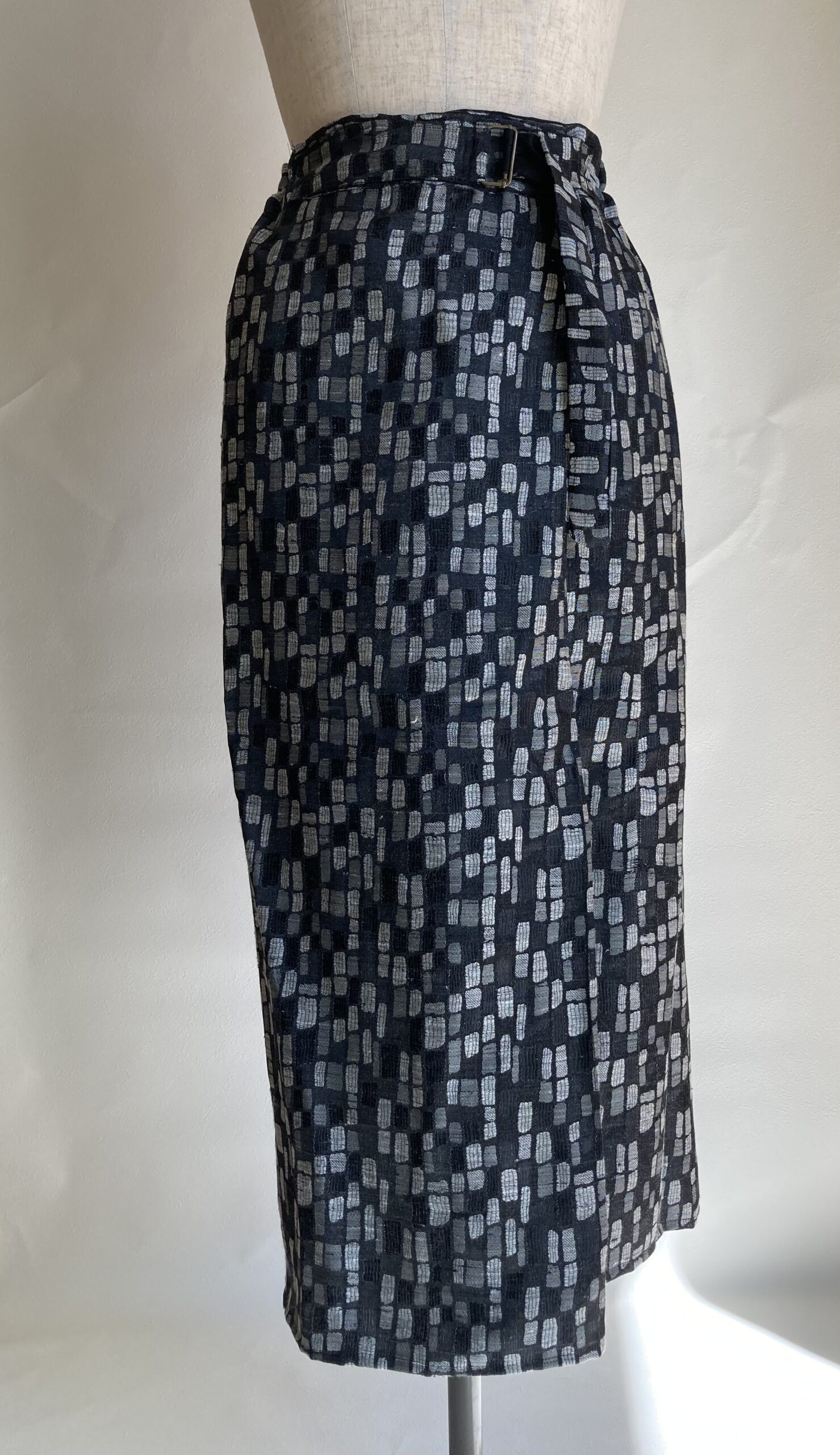 個性的な黒と灰色の四角い柄の生地はひざ下丈のスカートへ