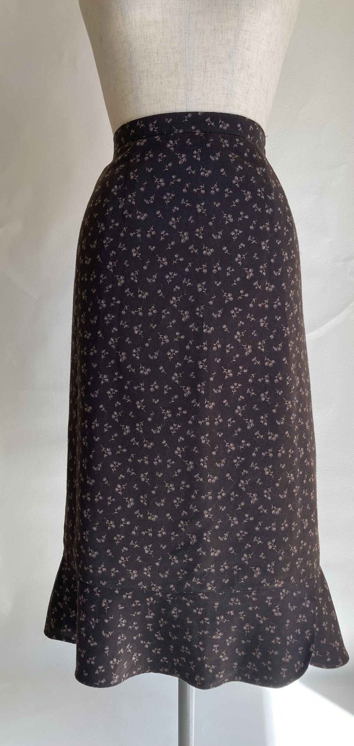小花柄の多少起毛した茶色の生地はひざ下スカートへ